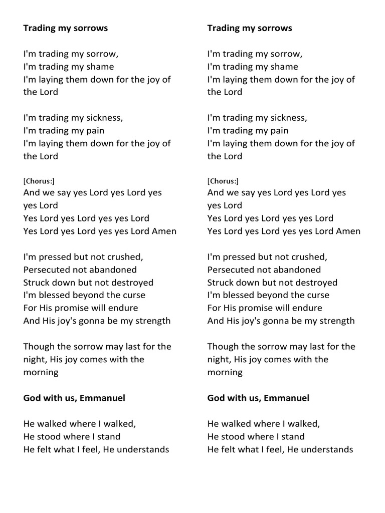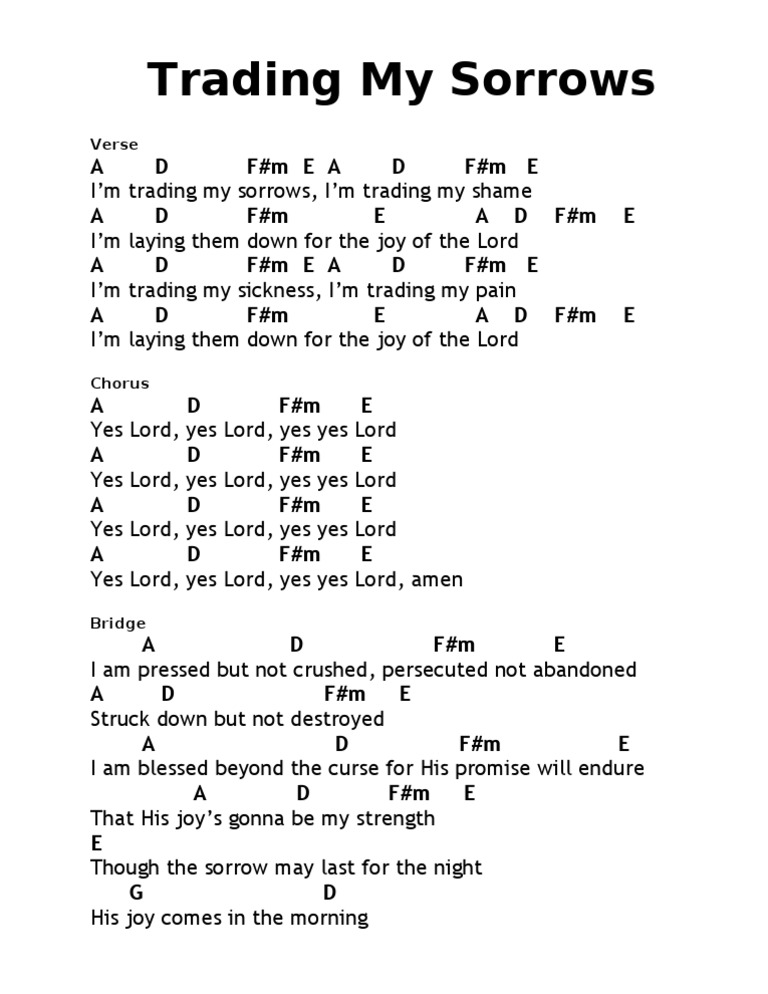 . Im laying them down for the joy of the Lord. Verse G C Em D Im Trading my sor-rows G C Em DF Im trading my shame G C Em D G C Em D Im laying them down for the joy of the lord G C Em D Im trading my sick-ness G C Em DF Im. Lyric Video for Trading My Sorrows from TOP 25 Praise Songs 2005 from Maranatha.